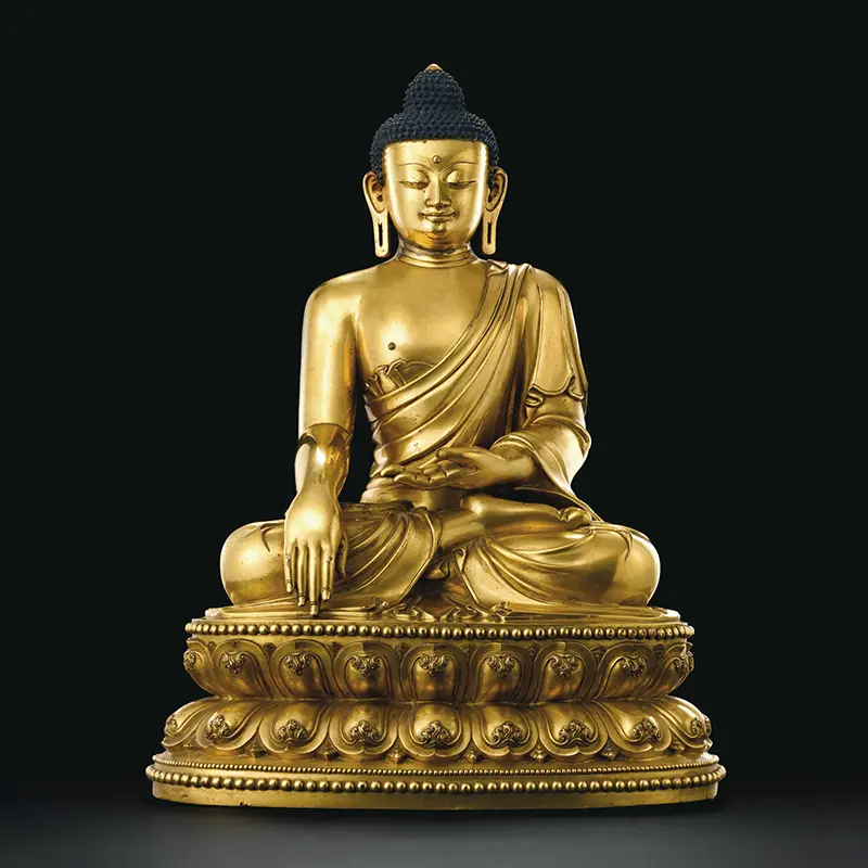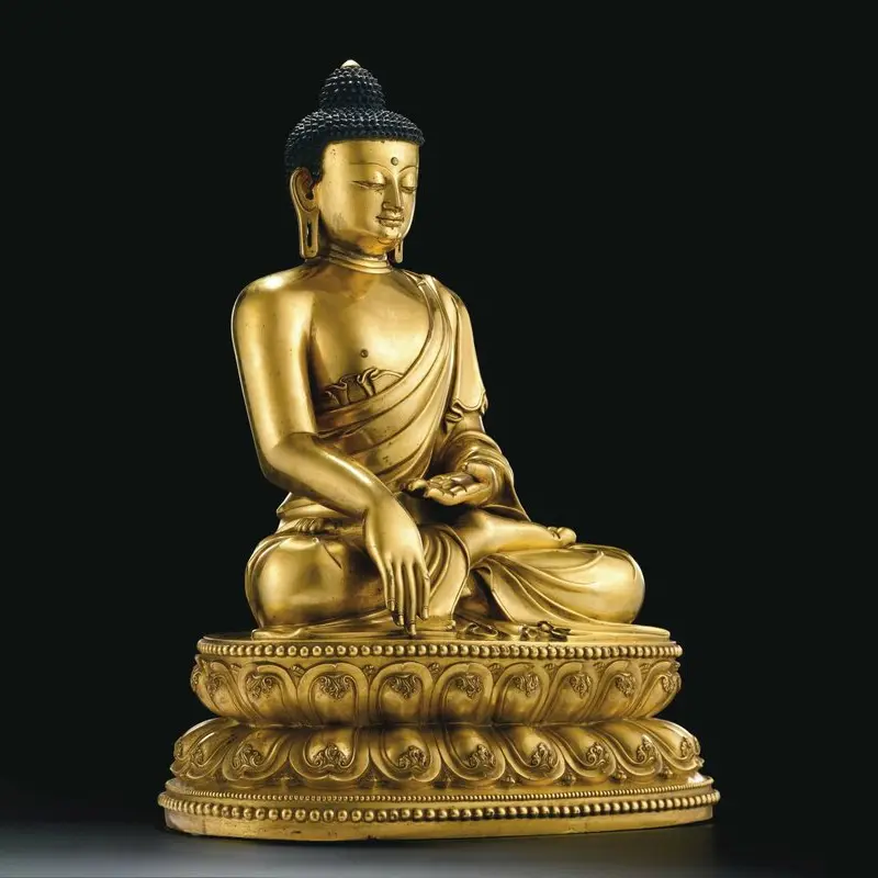Shakyamuni Buddha is the founder of the Buddhist religion. The statue was made by silica sol casting. The surface is very smooth, and the lines of clothes are very fluent. The whole surface is covered by 24K gold leaves.