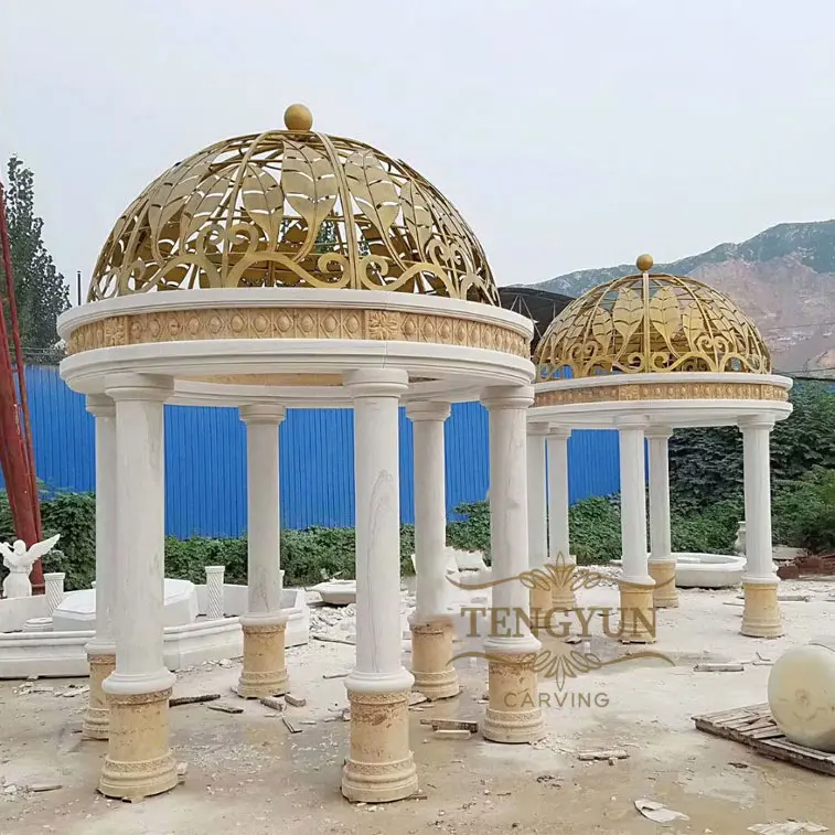 China Factory Custom Made Natural White Marble And Travertine Carved Pavilion With Glod Dome Top