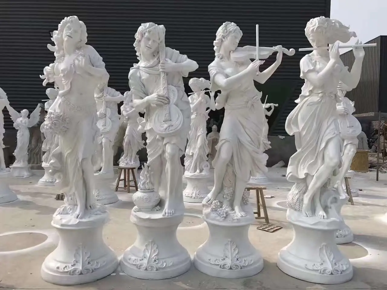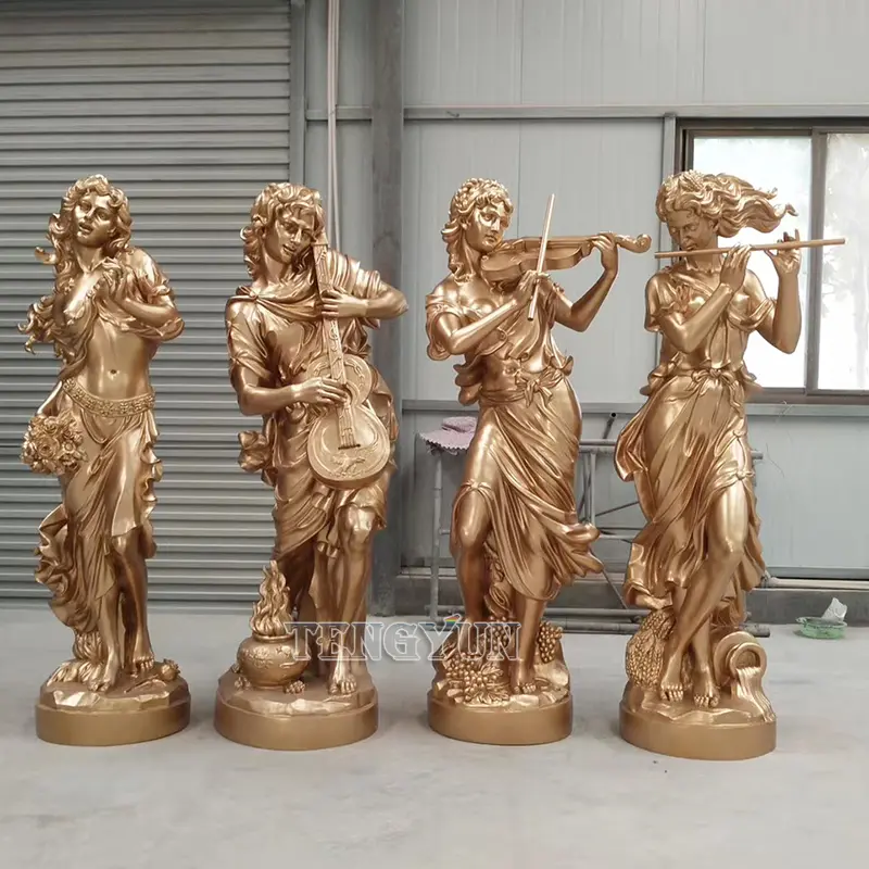 We make this set of musical figures female statues in fiberglass material. The surface with golden colors makes it look like luxury, but it's much cheaper than real gold angel sculpture.