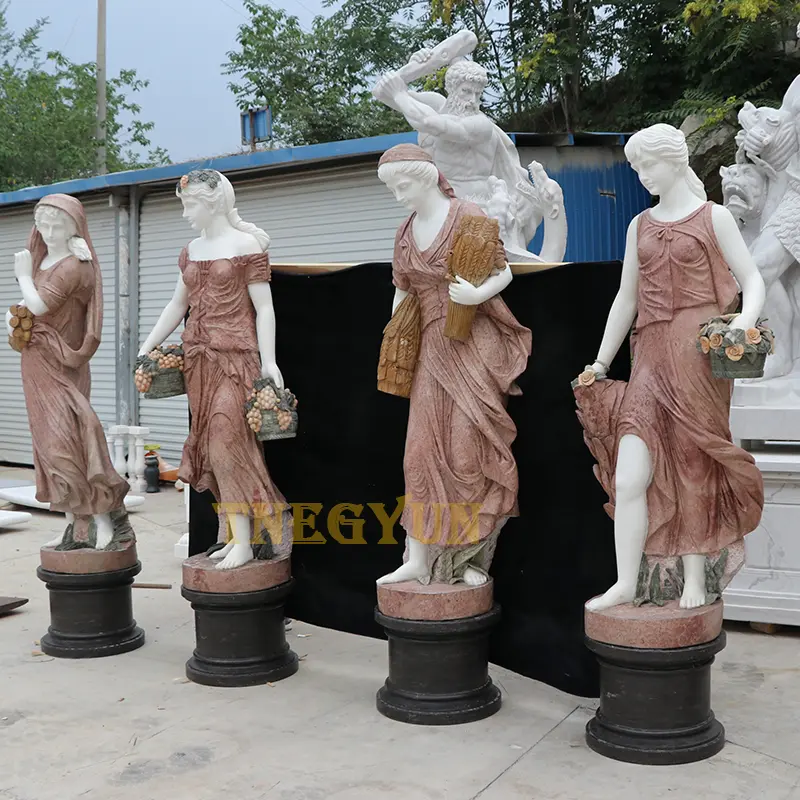 Except white marble, we also have stone four season statues carved in different colors of natural marble. We use different colorful marble to carve different parts of the statues. Then glue all parts together. These kinds of garden four seasons sculptures are colorful, looks more beautiful.