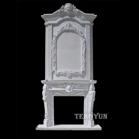 Every detail of this sculpted marble fireplace is hand-carved by skilled artisans, ensuring precision and beauty. The intricate carving highlights the natural veining of the white marble, making each piece truly unique.