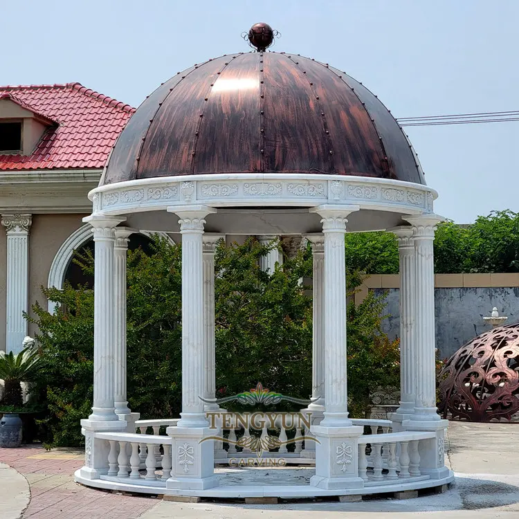 Tengyun Carving is the manufacturer of kinds of sculptures and stone products. We have different styles of stone gazebos for sale. Our engravers carved them out with excellent engraving techniques. Six columns, eight columns or more columns to support the round roof. We can make suitable popular gazebo with pillars based on your installing site. We can also customize outdoor garden marble or granite gazebo based on your need.