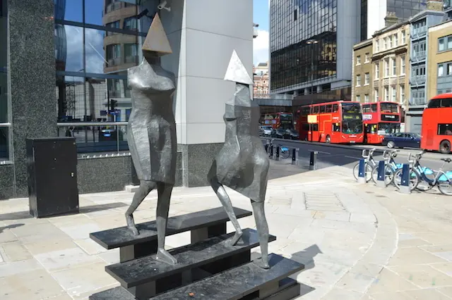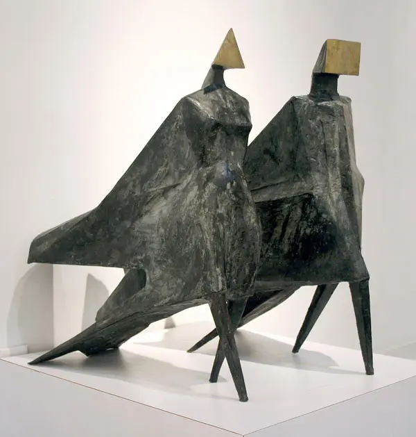 Chadwick's sculptures, cast in bronze, feature striking triangular forms and distinctively shaped heads. Male figures boast rectangular heads, while female figures showcase triangular heads, adding a unique touch to these artworks.