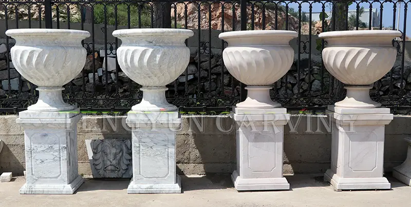 1. Material: This pair of the stone flowerpot is natural marble carved. Natural stone marble carved vases are more upscale.