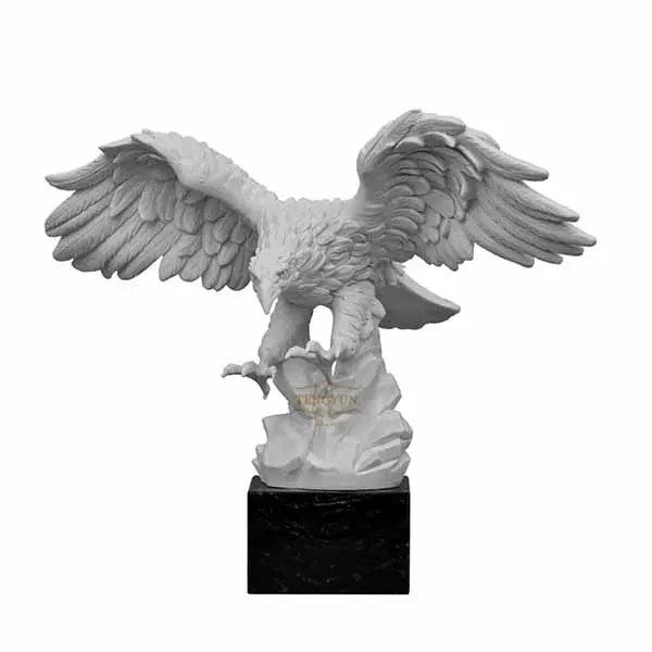 The eagle statue is usually depicted in a naturalistic pose, with outstretched wings and sharp talons. The head and beak are often slightly turned as if the bird is looking down at something below. Stone eagle statues often feature intricate detailing, especially in the feathers, beak, and talons. The texture of the stone may also be carved to resemble feathers. Stone eagle statues often have a base or pedestal made of the same material as the statue itself, which provides stability and elevates the sculpture off the ground.