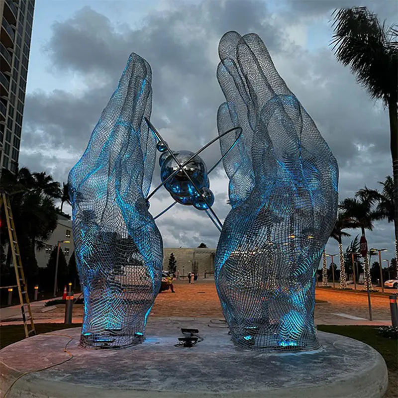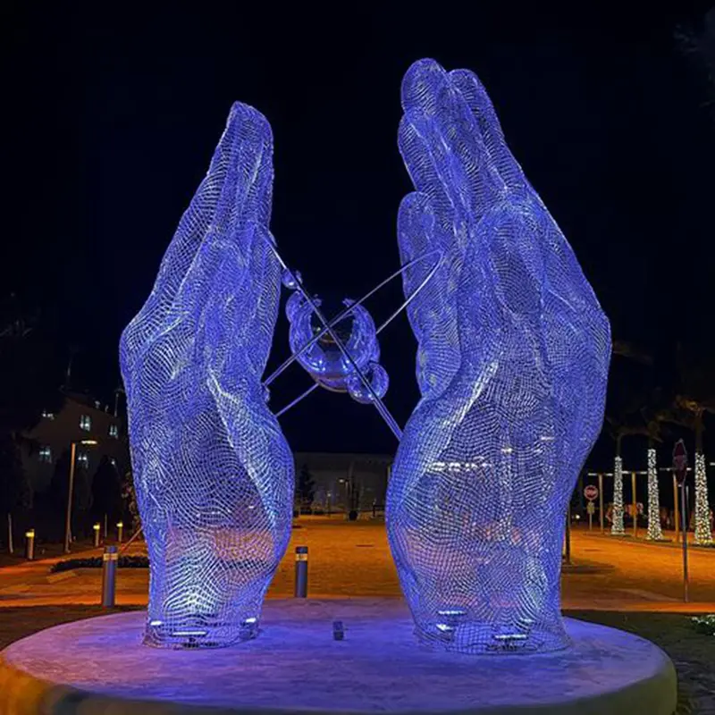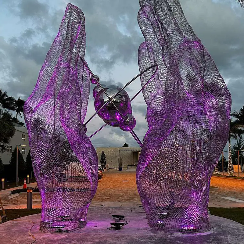 Unveiling our Stainless Steel Wire Mesh Sculpture of Hands Holding Planets, a stunning and imaginative outdoor artwork designed to inspire awe and wonder. Crafted from durable stainless steel wire mesh, this large-scale sculpture depicts a pair of gracefully cupped hands gently cradling several planets, symbolizing a harmonious relationship between humanity and the cosmos.