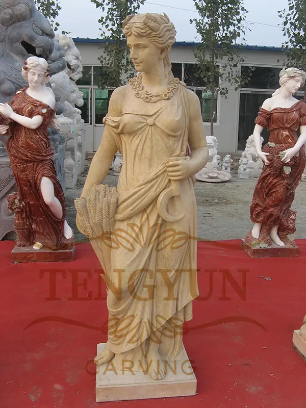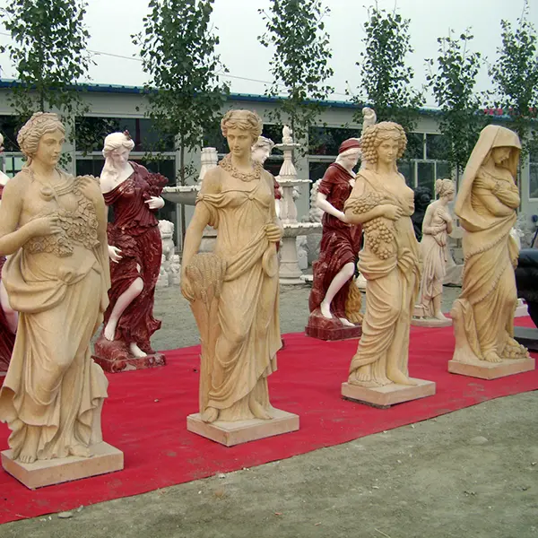 For the Greek statue four season Goddess, there are different designs with different colors, normally we make the statue with white marble which looks very natural and luxurious. Of course, any color or material is depending on your requirements. For us, we just need one picture or your idea and then we can finish the perfect artwork for you.