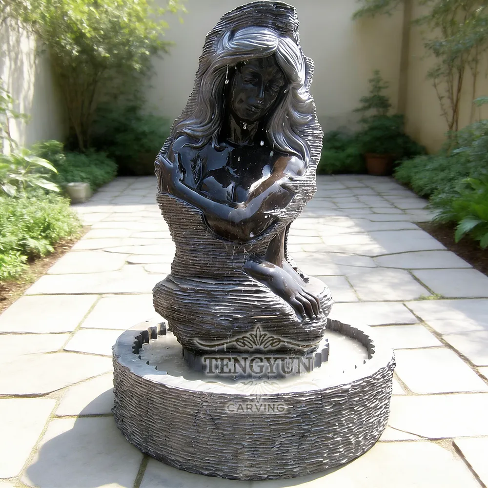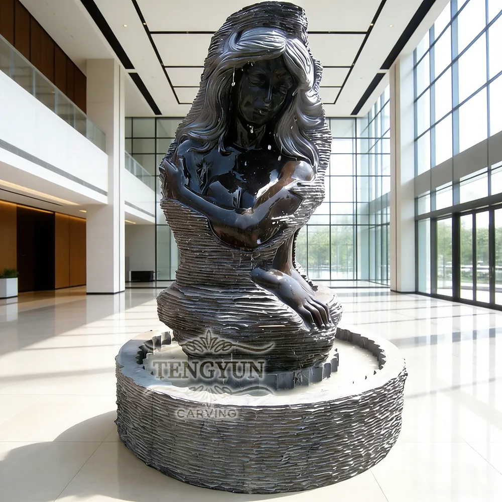 Elevate your space with this exquisite hand-carved black marble water fountain, a masterpiece of natural stone artistry. Crafted entirely from premium natural black marble, this stunning woman fountain sculpture features a serene female figure seated in graceful repose, with water gently cascading from her flowing hair into a textured stone basin below.
