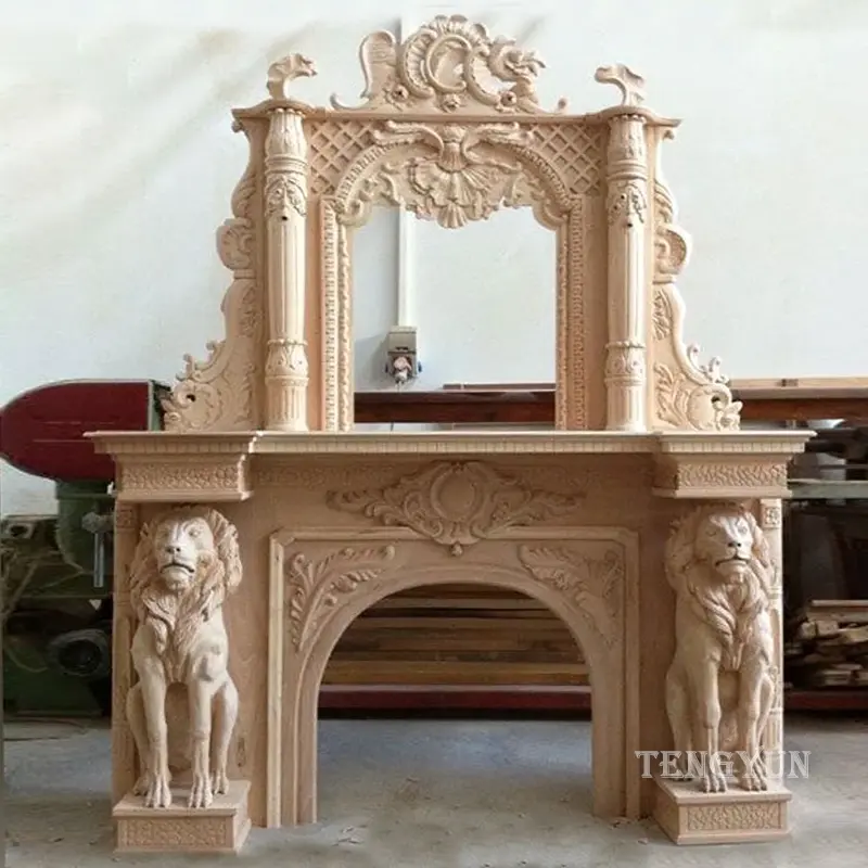 Home Decorative Large Luxury Marble Double Layers Fireplace Mantel With Lion Sculptures