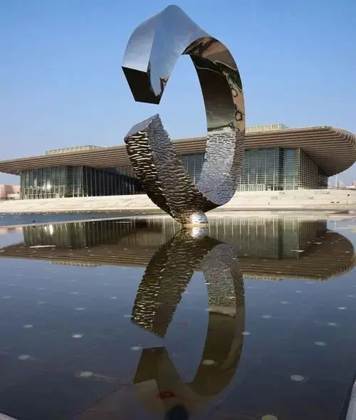 This modern sculpture is called " Moon In Water" sculpture. Using stainless steel material to make the moon shape, and then installed it in a lake or large water pool. The sculpture's reflection reflected in the water like a water crescent. So this sculpture is very popular for city square, a modern and artistic sculpture.