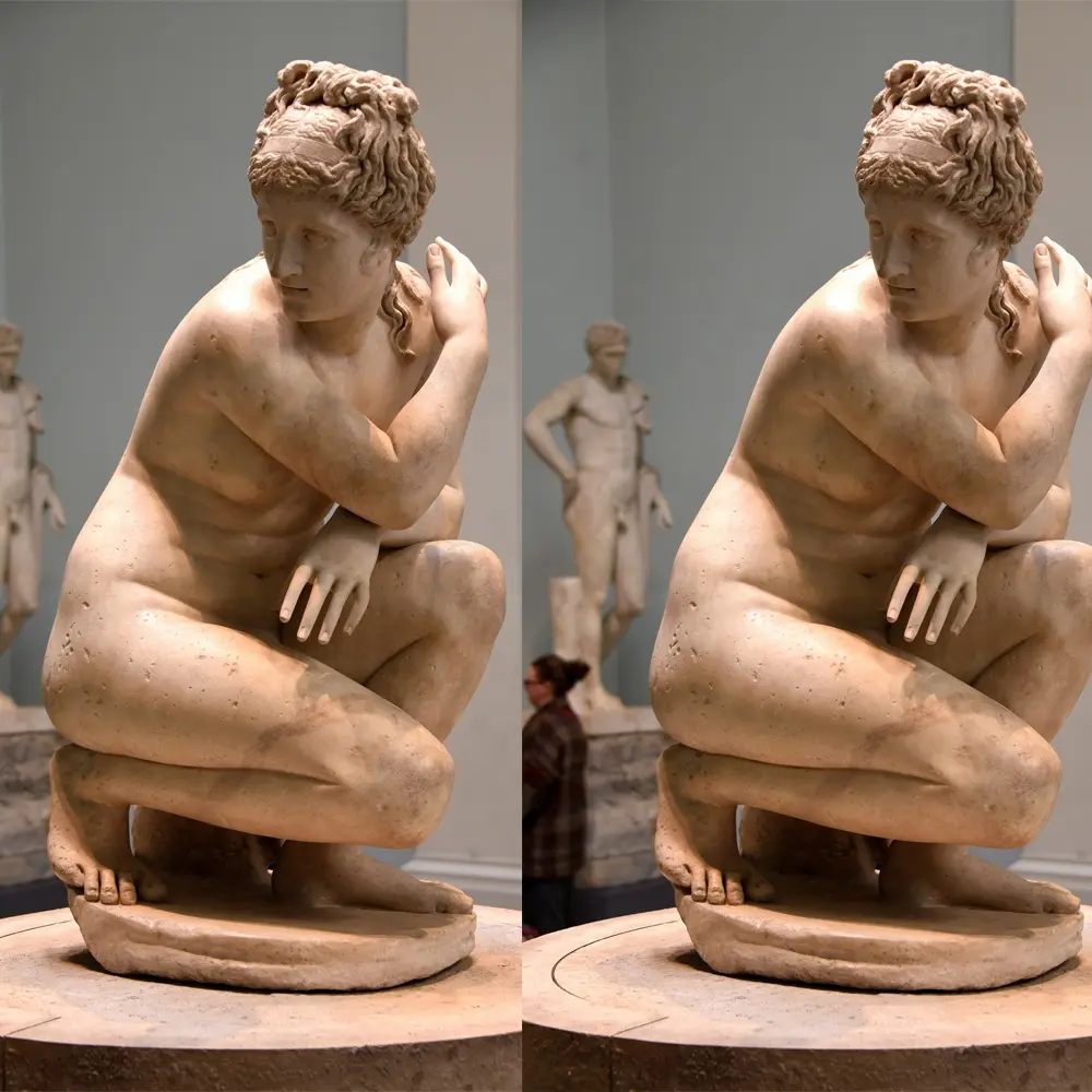 1. Material: The nude famous Greece statue naked lady sculpture is natural white marble carved. Almost all marbles have natural venis, this is the mark of marble over time. Natural white marble veins make your statue unique in the world.