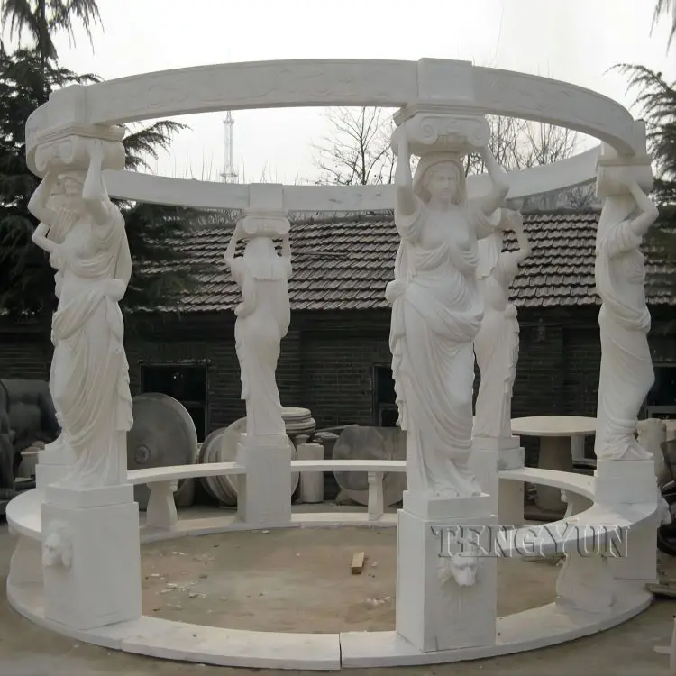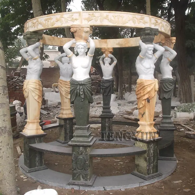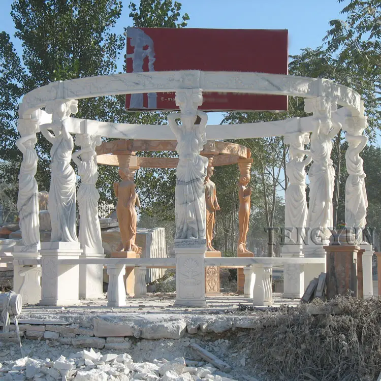 Description: The gazebo is marble carved, the roof is iron material. Eight or six beautiful ladies statues as pillars to support the large marble gazebo. Each lady statue holds a grape basket. Natural marble with natural colors and veins make your marble gazebo unique in the world.