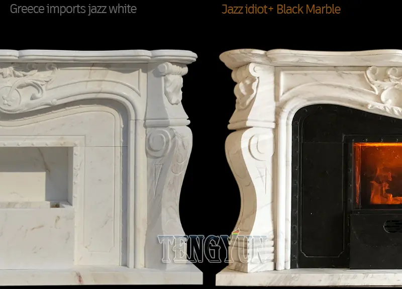 1. Grade A+ natural white marble or white marble+ black granite mixed stone hand carved. There are natural veins on marble. Natural veins make your fireplace unique in the world.