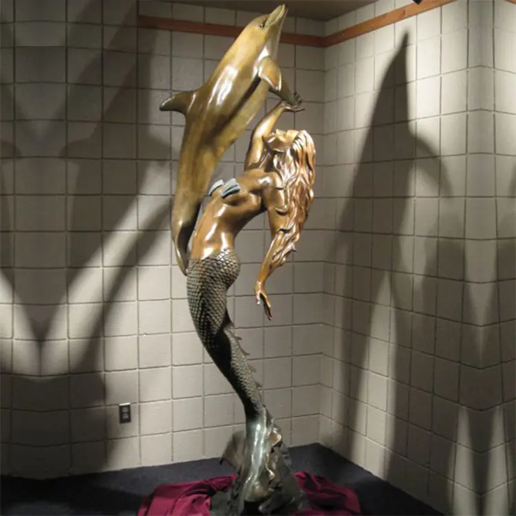 The mermaid statues with dolphin sculptures are bronze cast, we can make it in any size as your request. If you are interested in it, welcome to contact us for more information and prices.
