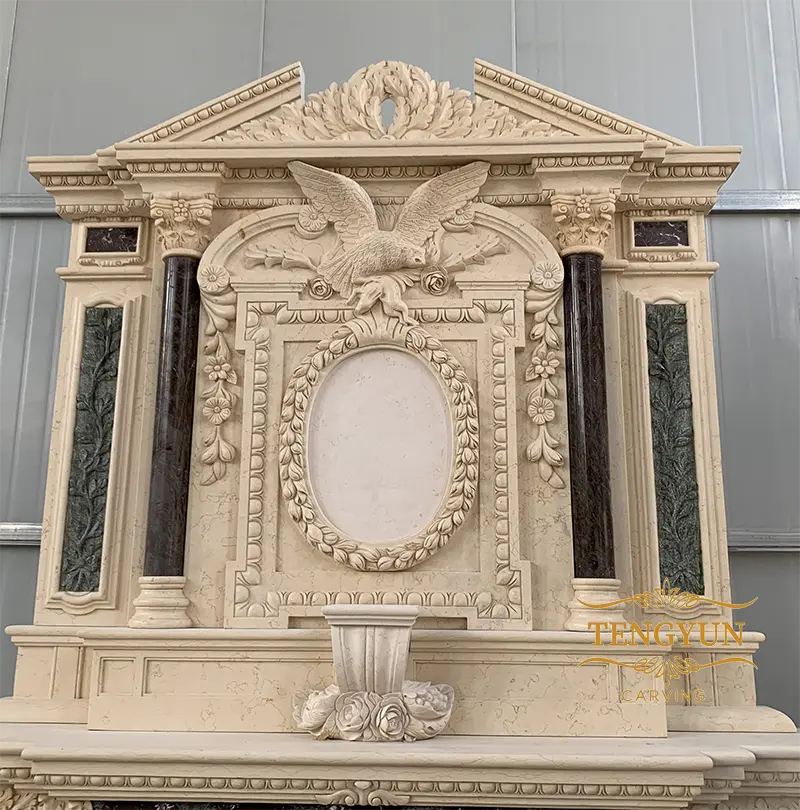 Opulent Two-Tier Structure: The fireplace features an imposing two-tier design, with delicately sculpted columns and ornamental carvings that exude aristocratic elegance. The architectural structure enhances the visual presence of the fireplace, making it a grand focal point in any space.