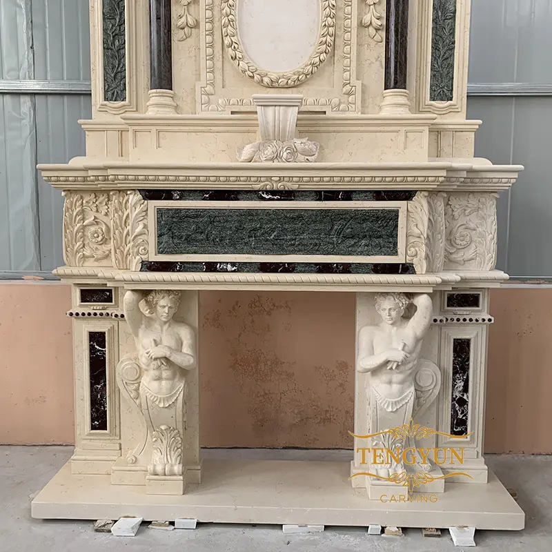 This magnificent double layers marble fireplace is a true masterpiece, hand-carved from the finest Egyptian beige marble and adorned with elegant green and black natural marble accents. With an abundance of intricate sculptural details, it embodies a sense of opulence and classical beauty, making it the perfect statement piece for grand living rooms, luxurious foyers, or high-end spaces.