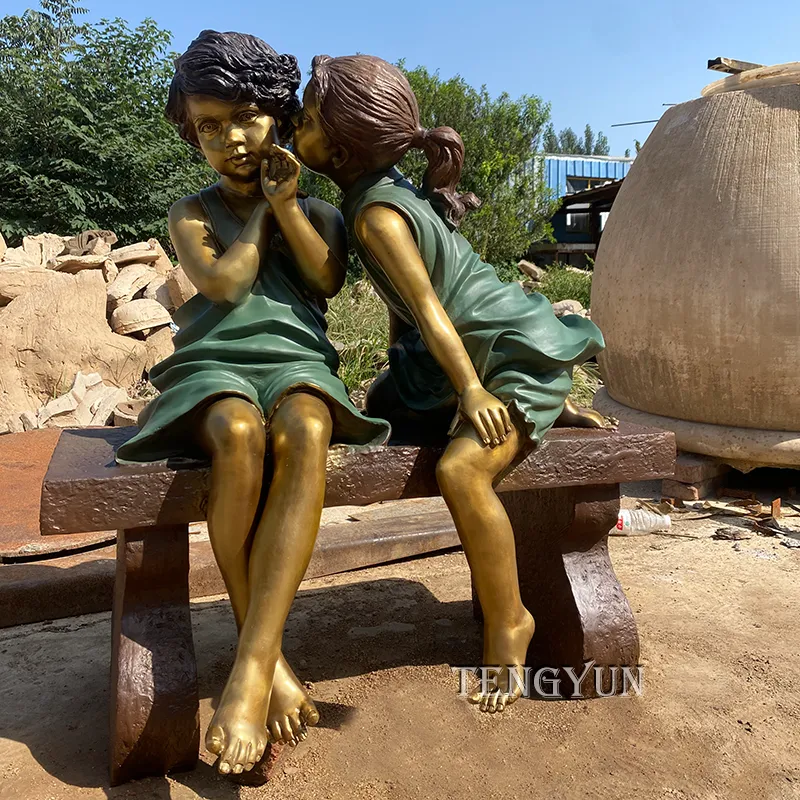 Celebrate the innocence of youth and the beauty of companionship with this handcrafted bronze sculpture of a boy and girl sharing a secret on a rustic bench. This charming artwork captures a tender childhood moment, making it a timeless piece for both private collections and public installations.