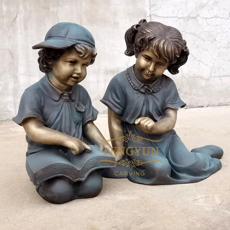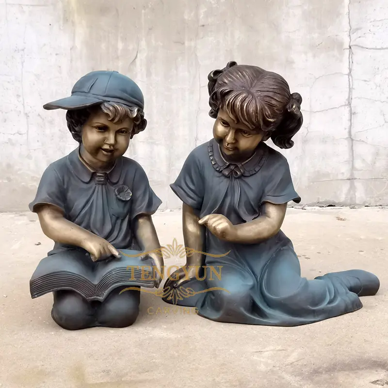 The bronze sculpture depicts a heartwarming scene: a young boy and girl sitting on the grass, close to each other, focused on an open book. The scene presents a feeling of intimacy and the pleasure of exploring knowledge together. The workmanship of the bronze carving is exquisite, the details are lifelike, and the expressions of the little boy and girl are full of curiosity and excitement, as if they are immersed in the world of the book. The whole sculpture reflects the importance of unity, cooperation and learning, but also shows the infinite beauty and longing of childhood. This copper sculpture is not only a work of art, but also a symbol of warmth and inspiration.al.