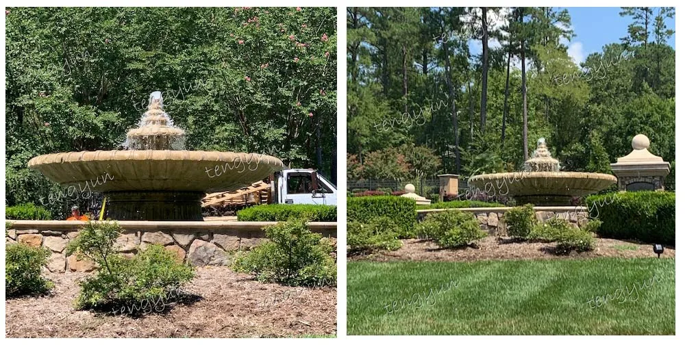 After reviewing the client’s community photos and overall landscape style, we designed the fountain and recommended using yellow granite, a material known for its durability and natural elegance. Compared with marble, granite is stronger, more weather-resistant, and ideal for outdoor installations, ensuring long-term beauty with minimal maintenance.