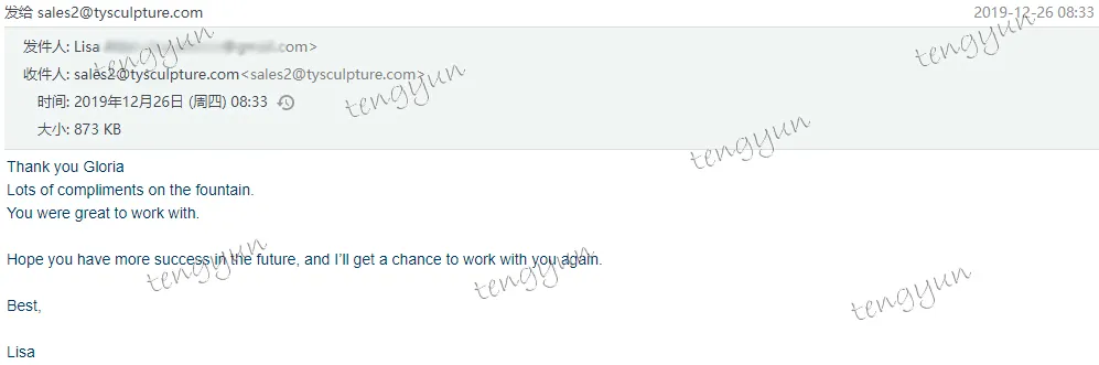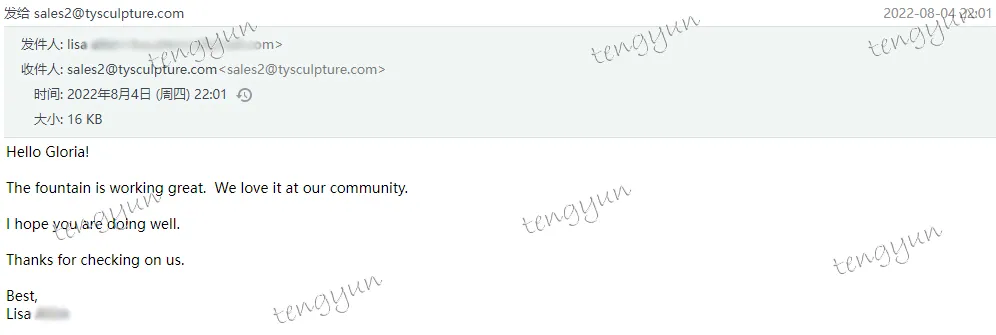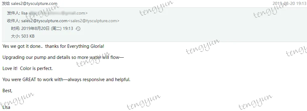 Before shipment, we conducted a full water test—running the fountain to observe the water circulation, pressure, and visual effect. During this process, we took photos and videos and shared them with the client for final confirmation.