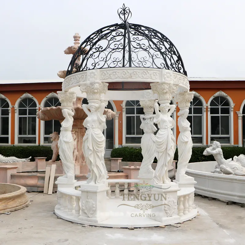 These are marble gazebos with statues as columns. This round shape marble gazebo is the most classic and simple design with 6 or 8 lady pillars as support and iron roof above. There are many different models of marble carved backyard pavilions. But they usually have one thing in common, that’s metal roof on top.