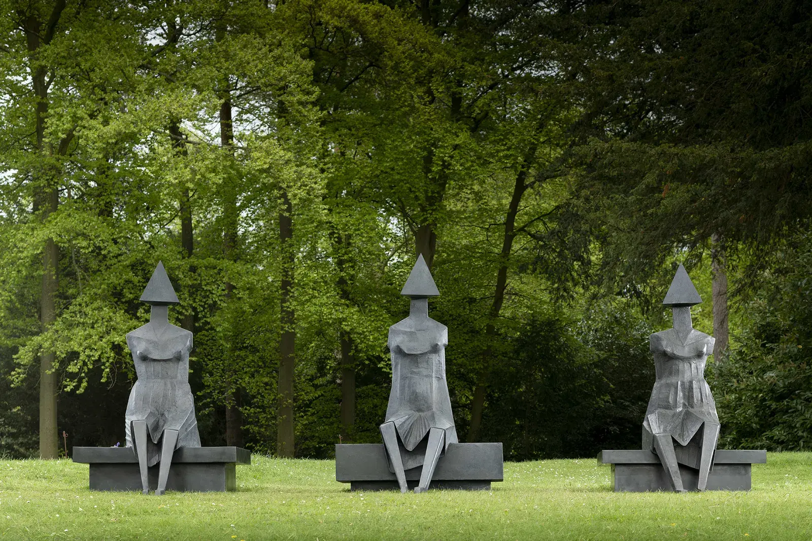 Chadwick's sculptures, cast in bronze, feature striking triangular forms and distinctively shaped heads. Male figures boast rectangular heads, while female figures showcase triangular heads, adding a unique touch to these artworks.