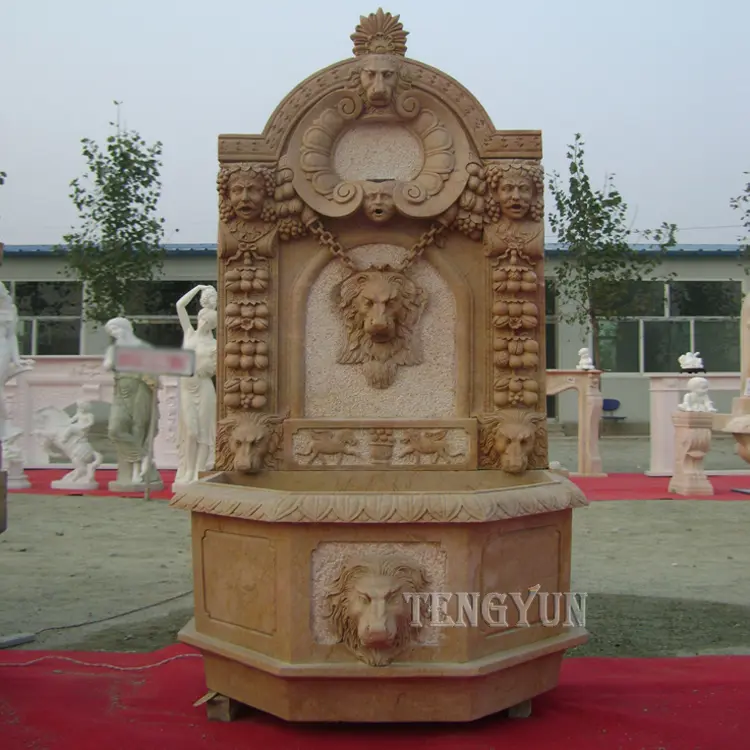 These are very finely carved stone wall fountain. Carved human head with grapes sculptures and lion head sculpture on the wall fountain. Water flows from the middle lion mouth. This is a very classic style.