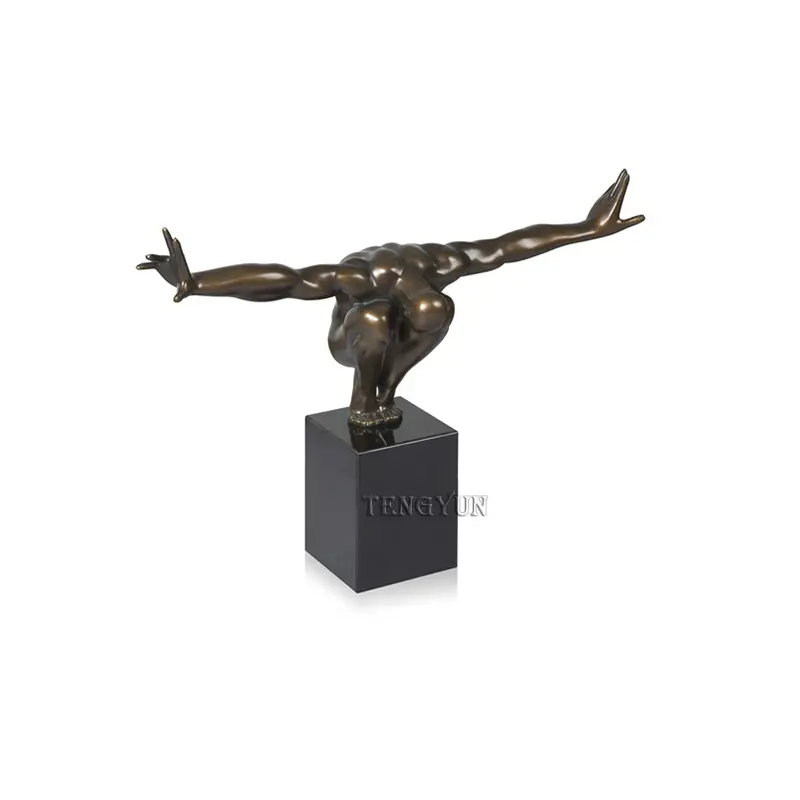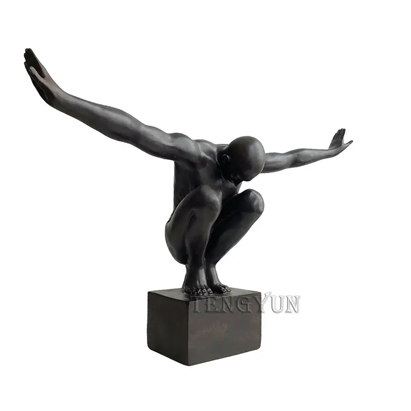 This squat nude man fiberglass sculpture of a naked muscular man stands out for its unique design and exquisite craftsmanship. The sculpture shows the pose of a strong man, squatting with his arms outstretched, as if to express the combination of strength and freedom. Every muscle line has been finely carved, showing the beauty and strength of the human body, which is amazing.