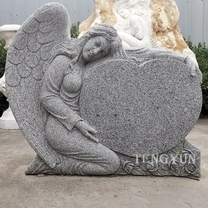 >>>This is a classic granite angel headstone, the grieving angel has a big heart beside her, expressing the loved one's missing the deceased. The big heart is flat and polished, epitaphs and portrait can be engraved on it.