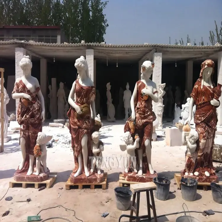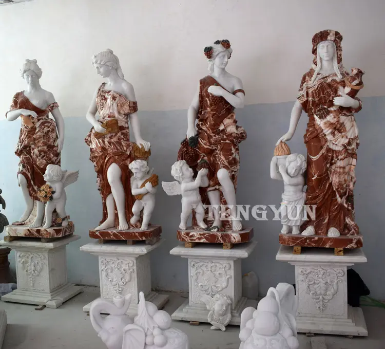 Unique textured blood stone carved clothes and hair accessories makes your four season statues unique in the world and looks so beautiful. Carving with white marble perfectly presents the beauty and elegance of Goddess four season statues and their little angels.