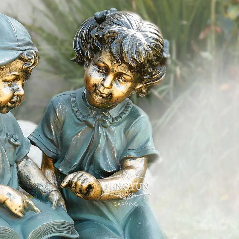 The outdoor bronze sculpture is a vivid and warm work of art. The copper sculpture is a vivid and warm work of art in which the little boy and girl sit together, leaning slightly, as if they are close to each other to share the joy of reading. Their expressions are full of concentration and curiosity, their eyes fixed on the page, and they seem to be immersed in the story. The details of the bronze sculpture are vivid, the subtle texture of the hair of the little boy and the little girl, the folds of the clothes, and the expressions of the two children all show the sculptor's attention to the details of nature and life and the exquisite craftsmanship.