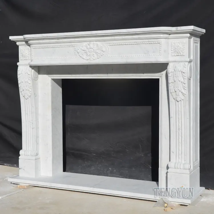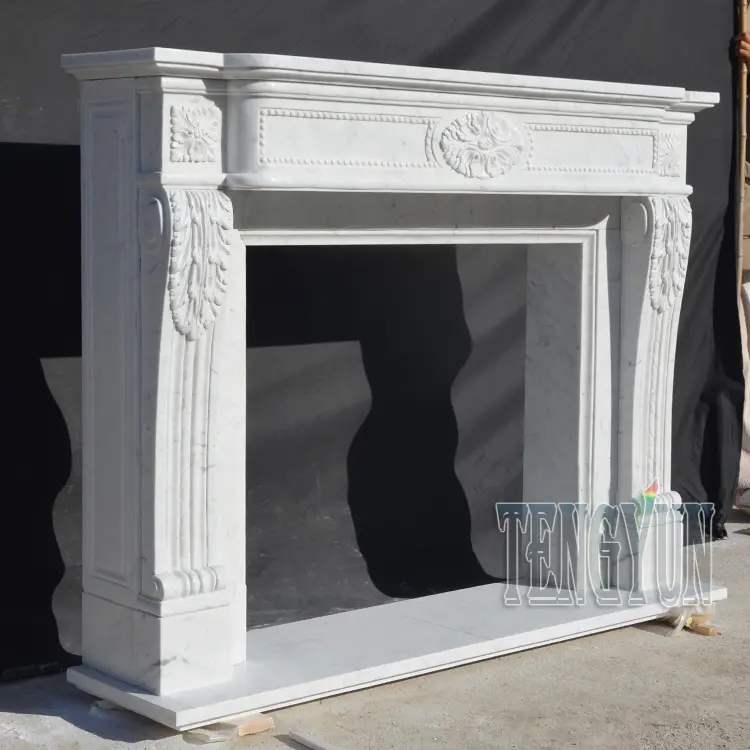 The fireplace is natural Italy carara white marble carved. Sizes can be customized. If you are interested in it, welocme to contact us for more information and price.