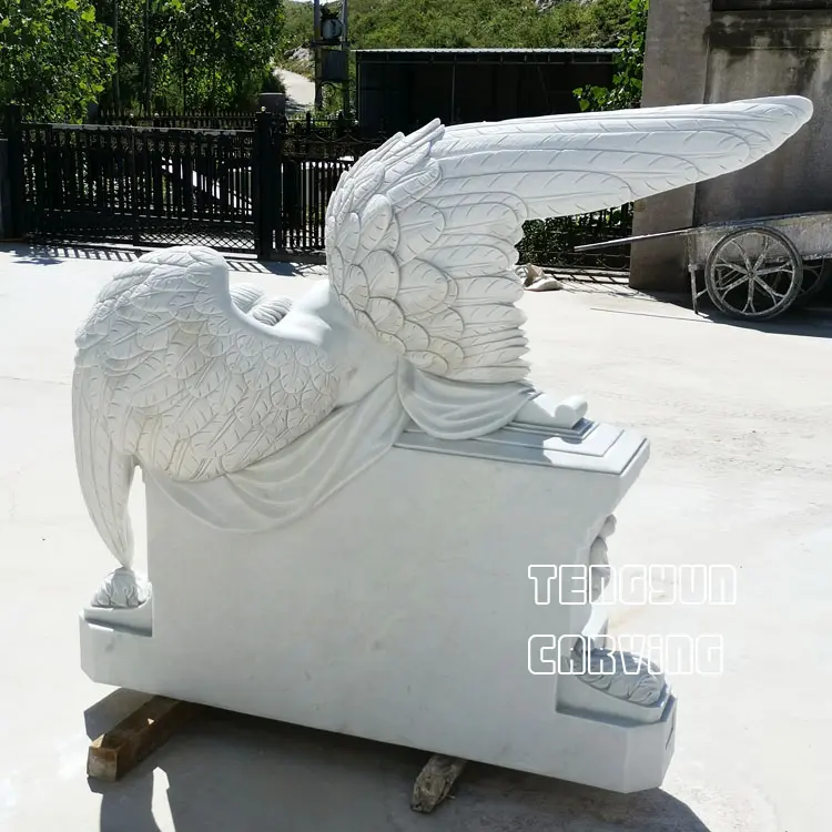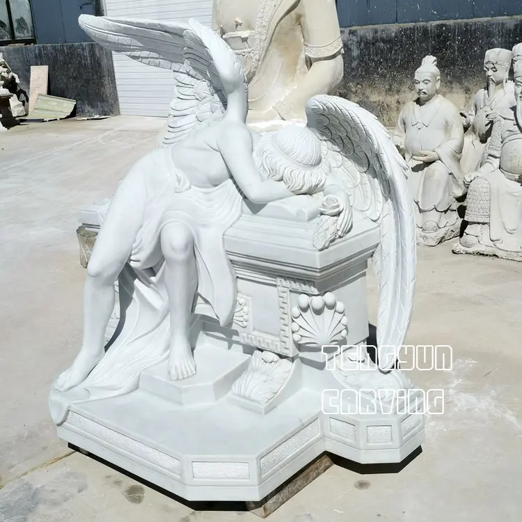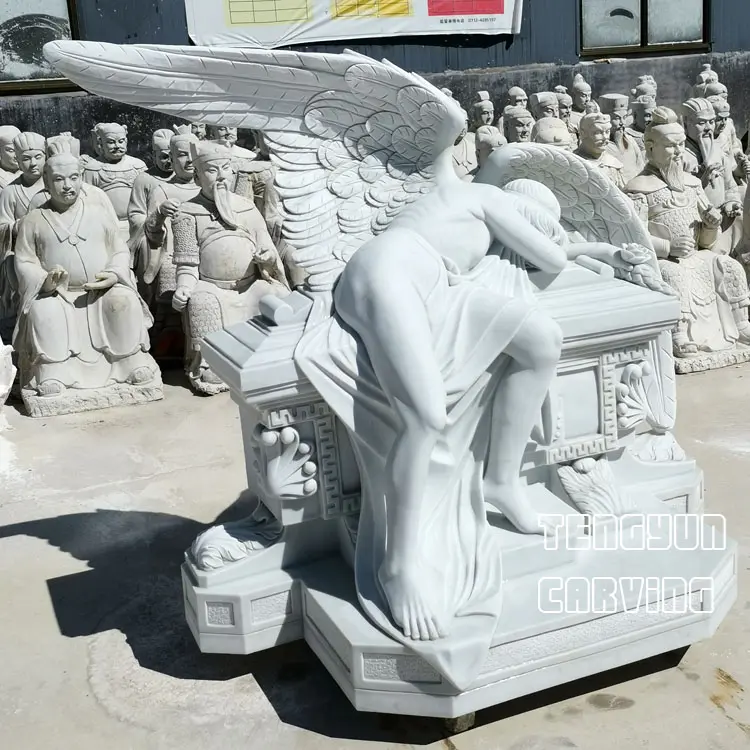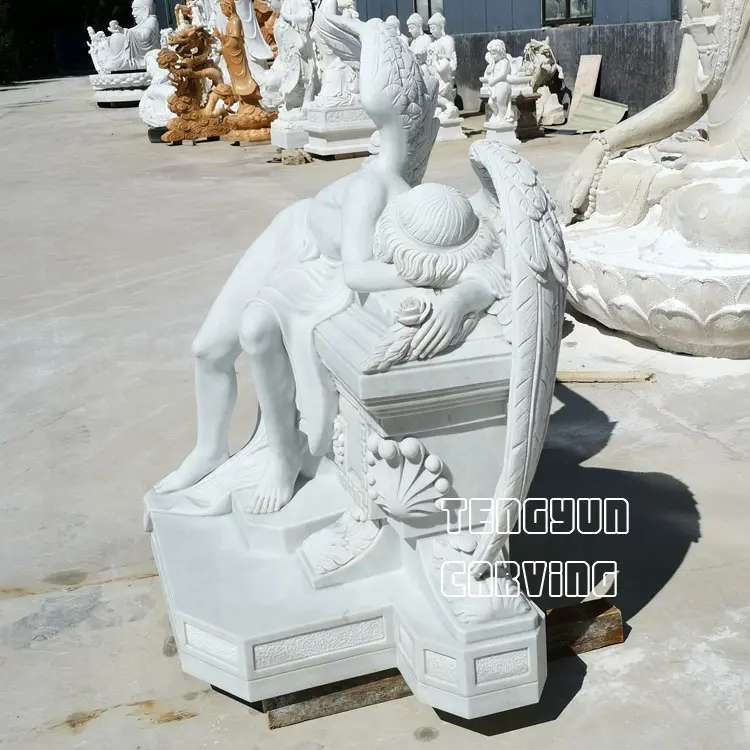 Our engravers carved them out with excellent engraving techniques to restore the original appearance of the angel sculptures to the greatest extent. Fine wings, well polished body, and fine base details make for fine angel statue which gives the marble sad angel statue life. Natural white marble veins makes your statue unique in the world. We believe that this boutique angel sculpture placed in the cemetery, will be a good guardian of your deceased relatives or friends.