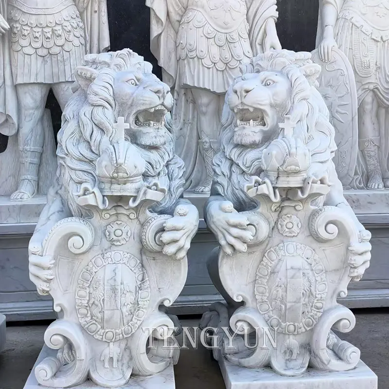 Tradition Stone Lion Statue With Shield Sculptures Natural White Marble Carved Guardians of lions For Sale