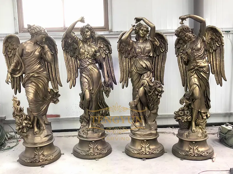 This set of resin angel statues are four season goddess statues, they are goddess Spring with Flowers, goddess Summer with Wheat, goddess Autumn with Grapes, and goddess Winter with Fire. Four season sculptures are very famous statues, they are weldly used for home, garden, square, mall, hotel and park decoration.