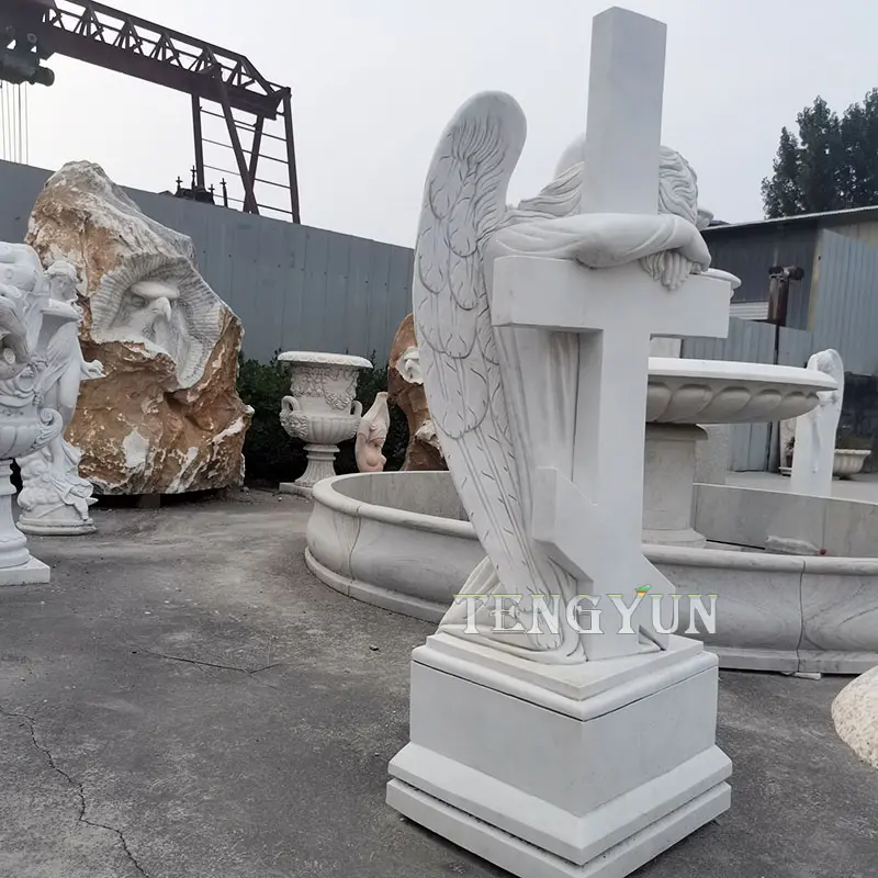 >>>The stone cross angel statue tombstone is 100% natural white marble carved.