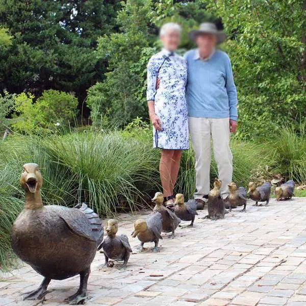 The cast bronze duck sculpture is made of cast copper material. Duck (a species of poultry) is the collective name for waterfowl of the Anatinae subfamily (Anatinae) of the Anseriformes Anatidae, or real duck. Ducks are relatively small, with short necks, and some genera have larger bills. The legs are behind the body (like a swan), so the gait is wobbly. The bronze duck sculpture works are highly decorative and practical; it pays attention to the depiction of animal forms, adds color to the statue, combines sculpture and painting, and complements each other, so that the work has the same beauty and appreciation value as painting.