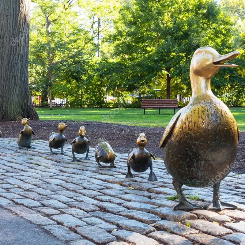 Make Way for Ducklings is installed in Boston Public Garden. Boston seems to have an indissoluble bond with the Ducks. Wild ducks are everywhere It is a world famous statue. The set of bronze statue is a mother bronze duck is walking with a group of ducklings. The tallest bronze duck stands 97cm tall. The caravan of bronze ducks set in Boston cobblestone spans 35 feet (10.67 m) from front to back.